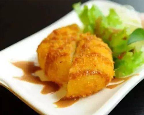 2.藕片沥干水分拍上一层生粉,用虾胶填满片放入油锅中,炸至熟捞起待用。