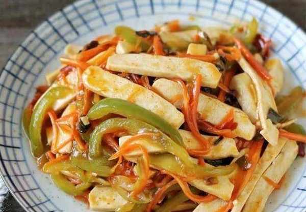 2、锅置旺火,油烧至60%热,在泡芙丝上抹油,然后捞出丝沥油,原锅留少许底油,70%热时,放入丝、香菜块和香料,迅速倒入锅中拌匀,勾芡,倒油装盘。