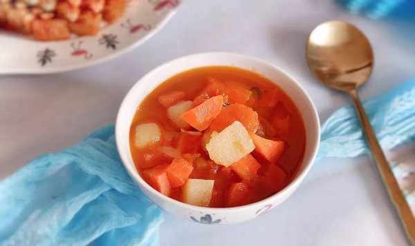 -材料-马铃薯1个、西红柿2个\胡萝卜1根、番茄酱1勺、酱油、盐、蔬果粉少许
