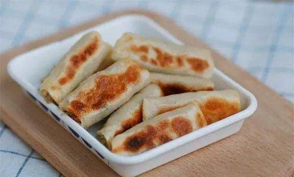 4、平底锅烧热,放少许油,将卷好的土豆贴放在平底锅上,用小火煎一两分钟。此刻,锅底呈金黄色。