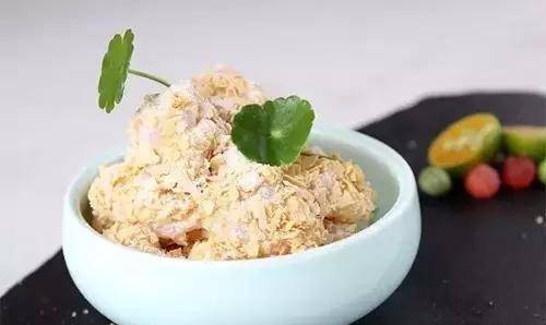 3.把裹上沙拉酱的虾球一个一个均匀地裹在燕麦片里,摆在盘子里作为装饰。