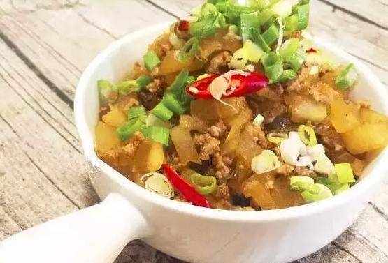 材料:大蒜1瓣(剁碎)、肉碎150克、去皮冬南瓜550克(烤熟)、干辣椒2条、葱末(或香菜碎)适量、酱油2-3汤匙、黄酒1大匙、白糖1茶匙、胡椒粉1茶匙、水100毫升。