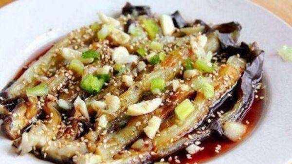 3、将茄子取出,放在盘子里,用刀切成条状,烧热浇上酱汁。4、在茄子上撒上葱花、芝麻和蒜末。