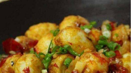 3、淋上准备好的鱼香酱,倒入鹌鹑蛋搅拌均匀,再撒少许淀粉勾芡收汁,最后撒上一些葱花稍微炒一下就可以上桌了。