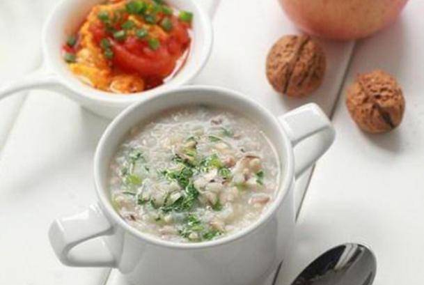 3、烧开后转小火,加入肉末拌匀,再开锅,加入香菇末拌匀,转小火煮10-15分钟左右,加入青菜末拌匀,撒上加盐调味即可食用。