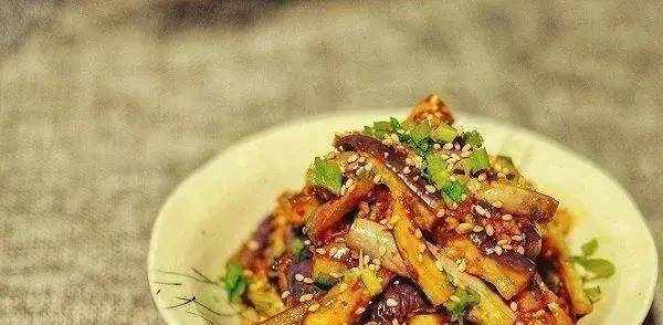 1、茄子整条洗净,蒸熟,晾凉,切成小条,装盘。