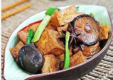 材料:北豆腐1块、干香菇6朵、青蒜(或蒜苗)3朵。姜1小块、葱1片、八角1粒、花椒8粒、桂皮1小份、老抽1/2茶匙、生抽1汤匙、香菇精、白糖各1茶匙,香油少许,盐少许。