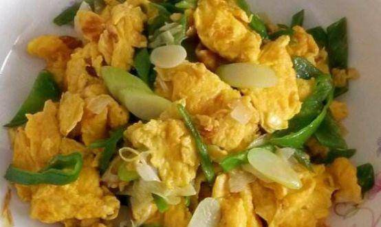 3、将打好的鸡蛋液淋入,快速翻炒。