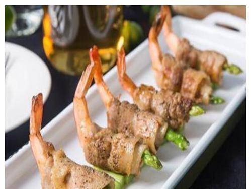 3、同一锅水汆虾仁至变色,捞出沥干备用,用猪肉片把虾仁和芦笋尖卷起来;