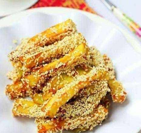 材料:茄子300g、油适量、白糖适量、白芝麻10g、淀粉20g