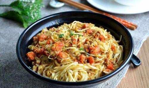 食材:蟹粉、姜片、黄酒、生抽、糖、盐、油、龙须面