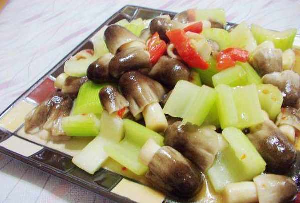材料:蘑菇250克,西芹250克,红椒1个,马蹄适量,姜适量,蒜适量,盐适量,鸡精适量