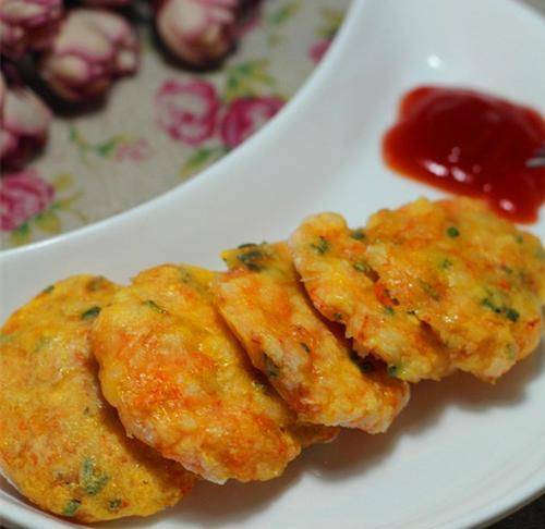 3、锅内倒入少许油烧热,用勺子挖一坨虾泥放入锅中。勺子底部蘸下油将虾泥压成小圆饼,用小火煎至两面金黄后捞出控油。