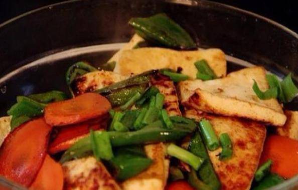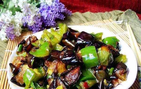 4.炒至茄子变软,加入青椒翻炒,青椒熟后加入适量盐和鸡精;