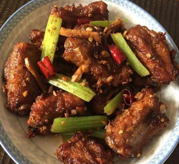 5、排骨取出过油,放凉,放入油锅中炸二遍,至排骨呈金黄色捞出;6、锅内留底油,50%热时,加入干辣椒、葱、姜、蒜把排骨腌好爆香,然后加入排骨翻炒均匀,撒上盐然后上胡椒粉。