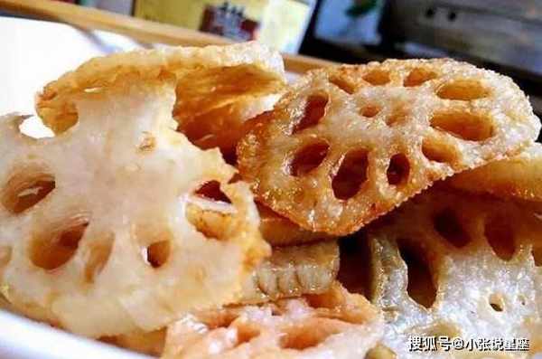 4.锅里放植物油烧热,将藕片一片片放入,炸至金黄色。