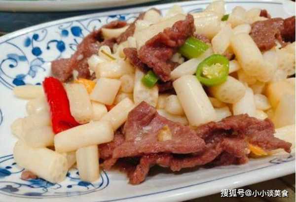 3.锅内放油,放入花椒和藕尖炒至生,加入牛肉炒匀,加少许盐调味出锅。