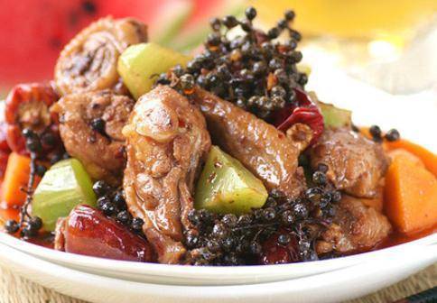 4.锅里倒入油,70%热时,加入葱姜炒香,然后倒入鸡块,用锅铲不断翻炒。煮约5分钟后,加入新鲜辣椒粉和干红辣椒再翻炒2分钟;