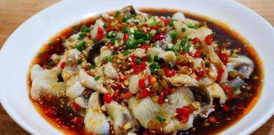 4.将盐、味精、糖、酱油、醋、炒姜、蒜、豆豉、红辣椒油、辣椒油、香油、炒花生放入大碗中拌匀,制成辣酱。锅开大火,油温40%,加入鱼片翻炒至熟。捞出沥油,盛入碗中淋上辣酱,撒上煮熟的芝麻和葱花。供应。