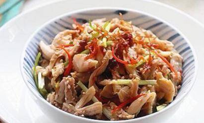 3、将鸡肉用小火浸泡10分钟左右;4.将鸡肉取出放凉,撕成小条,加入XO酱、香菜、辣椒片;加入香油;撒上芝麻,拌匀;它可以吃了。