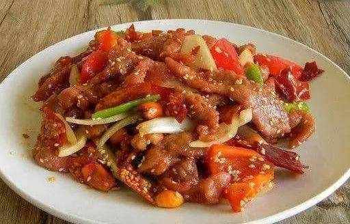 原材料:白煮五花肉500克,青椒和红辣椒250克,分别加葱,盐,料酒,味精,花生油和水淀粉。