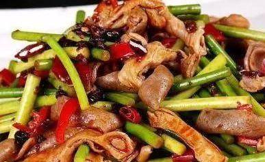 将猪肚切成薄片;切成青椒和红辣椒,除去面筋和种子,洗净,用沸水冲洗,除去并切成小块,在平底锅中加油加热,加入葱段和油炸,加入腹部切片并翻炒几下时,加入青椒,红辣椒,盐,料酒,味精,翻炒至八成熟,用淀粉稠化,用热油细雨,刚出锅。