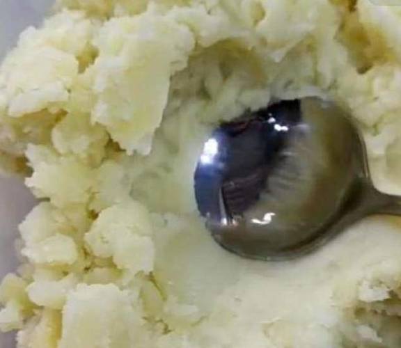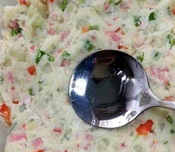 把切好的这些配料倒入土豆泥里,给搅拌均匀,融合在一起。