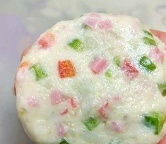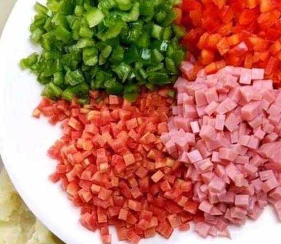 再切一点的青红辣椒丁、胡萝卜丁、火腿丁。
