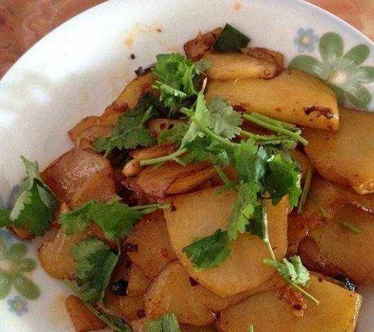 3、炒土豆时的油最好比平时炒菜用油多一匙,油多些土豆不容易散碎。