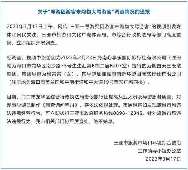 三亚市旅游市场和环境综合整治工作领导小组办公室关于“导游因游客未购物大骂游客”调查情况的通报(央广网发 图片来源于三亚发布微信公众号)