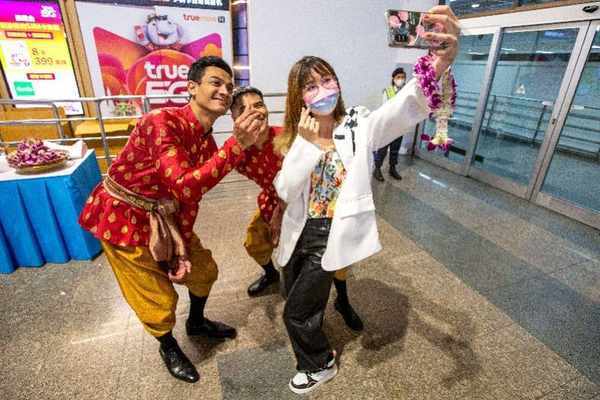 2月6日,在泰国曼谷廊曼国际机场,一名中国游客与工作人员自拍。新华社发