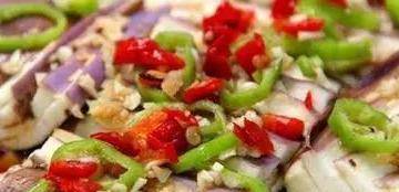 做法:1、茄子洗净,切成长条。红、青椒去籽、洗净,切成小块。