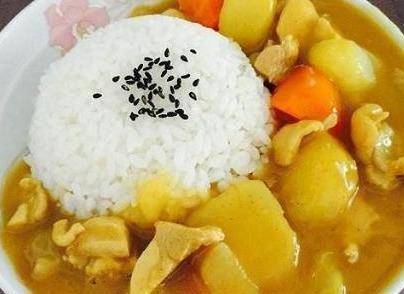 6.把米饭放在盘子里,和煮熟的咖喱一起上桌。