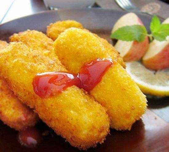 9取适量土豆泥搓圆成圆柱体,先撒上一层薄薄的面粉,再泡上蛋液,再撒上均匀的面包屑。