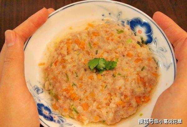 3.将切碎的胡萝卜和菱角加入2混合的肉末中,搅拌均匀,顺时针打至不需要面筋为止,因为这不是用来做丸子的!
