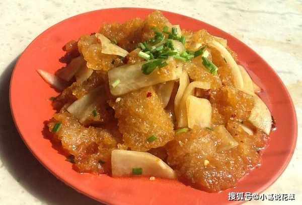 4、小葱洗净,葱花切碎。萝卜洗净切块,用盐浸泡10分钟左右,焯水3分钟,把干水和猪皮放在一起,加入葱花,辣椒面用油淋油,油到60时%热,然后加入生抽、辣椒油、香油、味精,拌匀,装盘,撒上葱花。