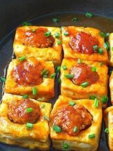 材料豆腐9片、花生油、生抽、胡椒粉、生粉、香葱、猪肉100克、盐、蚝油、鸡粉、水