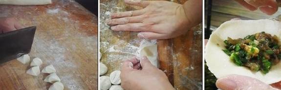 4、饺子馅和好,面团也饧(xing)好了,切成小剂子,擀成中间稍厚边缘稍薄的饺子皮儿;饺子馅放在皮儿中间位置。先把皮中间位置捏一下,固定住。两边往中间捏小褶,一个薄皮大馅的饺子就做好了;