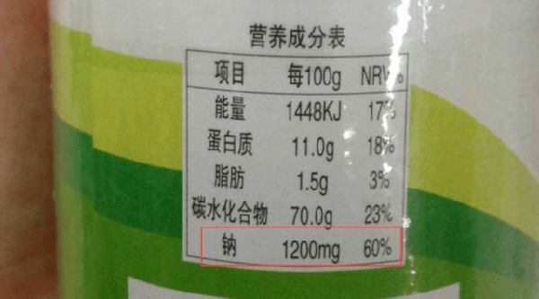 例如上面这张营养成分表,100克(二两)面中的钠含量为1200毫克,也就相当3克盐(400毫克钠相当于1克盐)。