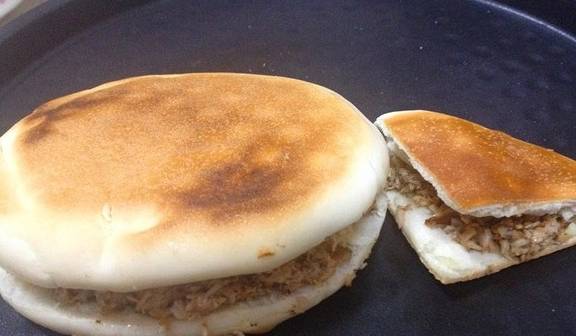5、取出面饼中间切开,肉块剁碎,香菜或其他蔬菜剁碎,放入面饼即可。