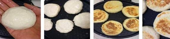 4、待面团二次发酵以后,双手沾水取适量大小,简单整理后放入电饼铛,合上紧上盖两面煎熟;