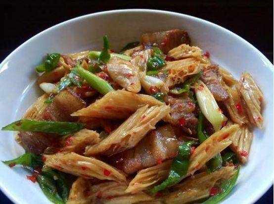 3、油锅烧热,下入肉片翻炒,炒至肉片变色加入红辣椒碎、腐竹炒约2分钟;