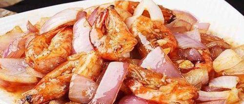 4.将准备好的大虾炒至变色;加入切碎的洋葱,炒好;加少许生抽;加盐、鸡粉、料酒调味;将淀粉倒入适量的水中;炒均匀;