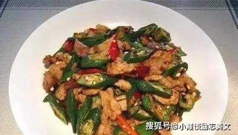 5、将肉片倒回锅里,继续翻炒,然后放入秋葵,大火翻炒一两分钟,再加入一茶匙郫县豆瓣酱,加酱油和盐。这一步的味道。继续煎约两分钟。