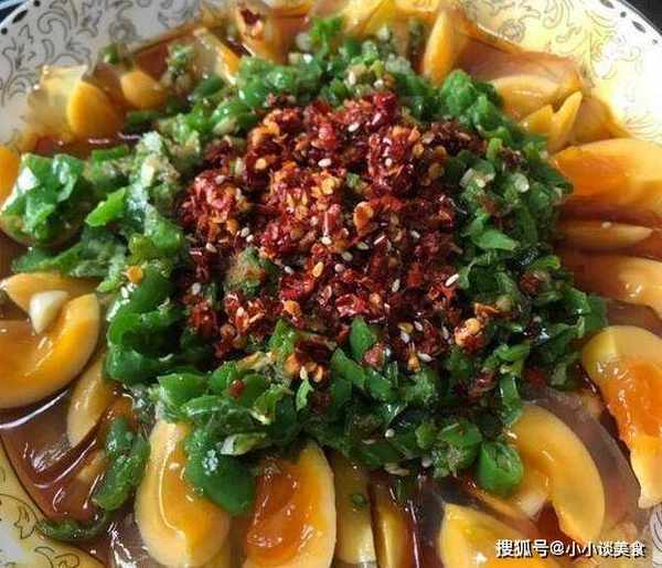 1、鸡蛋罐头去皮切小块,装盘;将辣椒切碎备用;