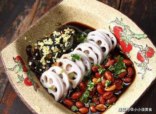 1.将花生米炒至红润酥脆。莲藕切开,用水焯一下。