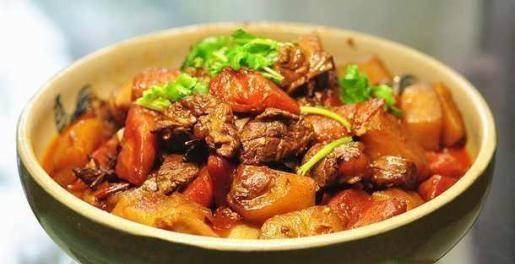 4、一个小时后,倒入胡萝卜,继续用文火煮至汤汁浓稠,胡萝卜变软,胡萝卜焦黄,羊肉即可出锅。最后的汤不要倒完全。