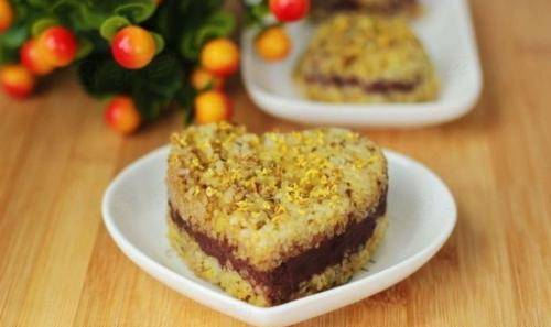 4、取一个干净的碗,在碗内壁抹一层薄薄的油,在碗底铺一层桂花小米,再抹一层红豆沙,铺一层。上面放小米,表面浇少许水,方便蒸。煮好后蒸,大火烧开水,再转中火蒸半小时左右。
