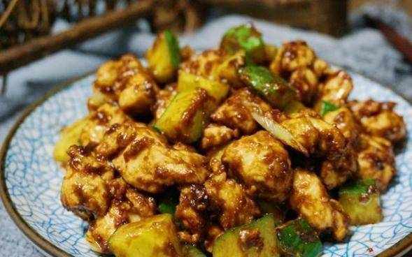 7、倒入切好的黄瓜丁,翻炒半分钟。