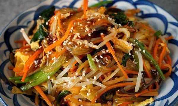 配料表:红薯粉;绿豆;胡萝卜;菠菜;黑木耳;蛋;切碎的洋葱;蒜茸;白芝麻;酱油、盐、糖;白胡椒粉;辣椒油